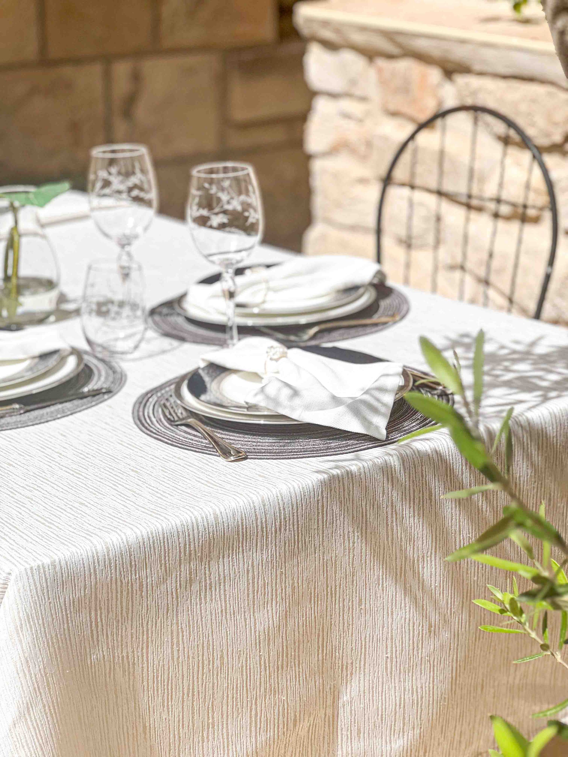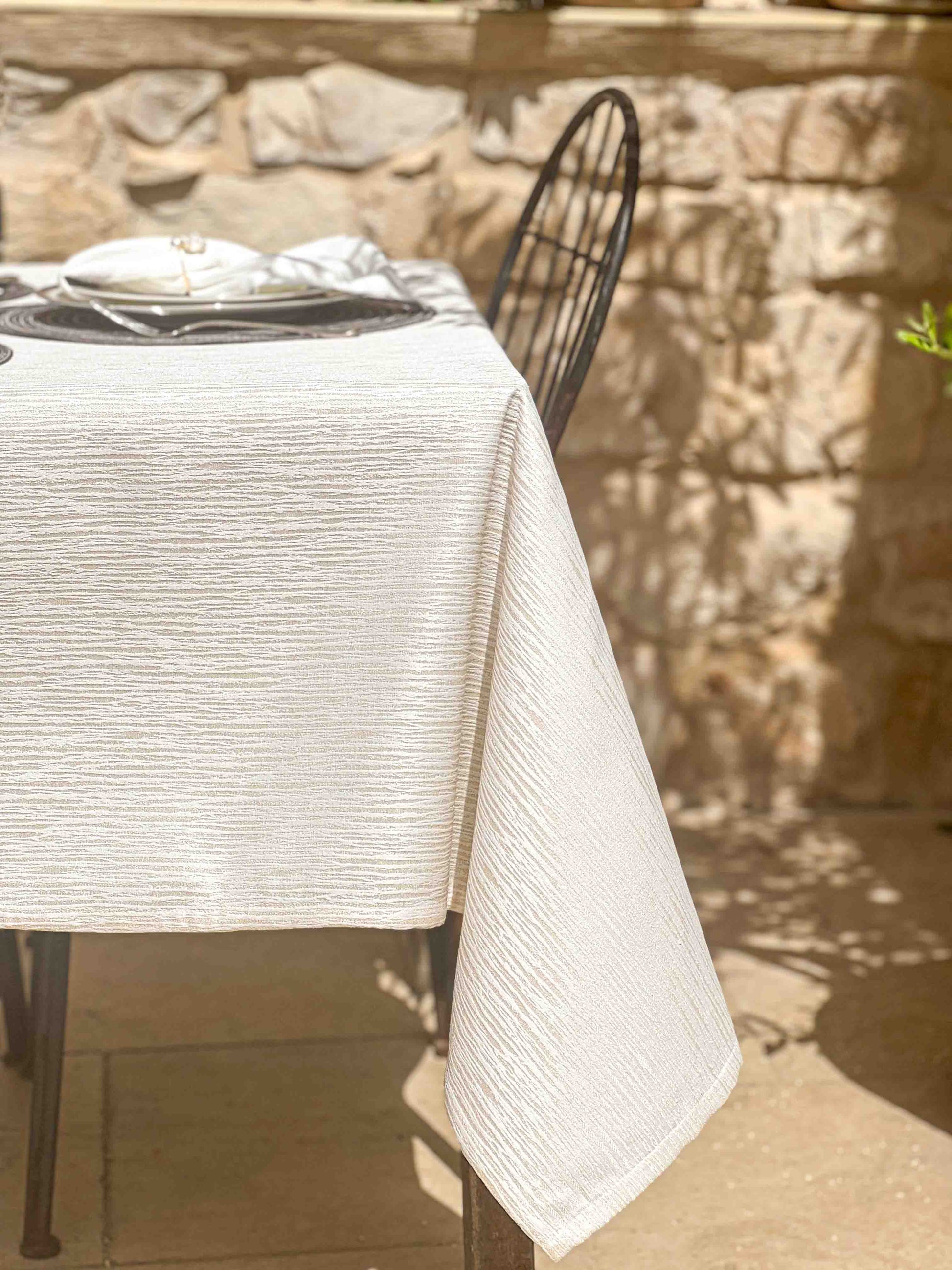 מפת שולחן בעלת טקסטורה אלגנטית בהשראת הטבע, בגוון שמפניה בהיר מאוד עם ברק פנינה עדין. המפה מתאימה למי שאוהבת עיצוב מינימליסטי אך עם נוכחות – נקייה, מודרנית, ומתוחכמת.מושלמת לאירוח מוקפד, לארוחת ערב חגיגית או לסידור שולחן שקט ומרשים כאחד.