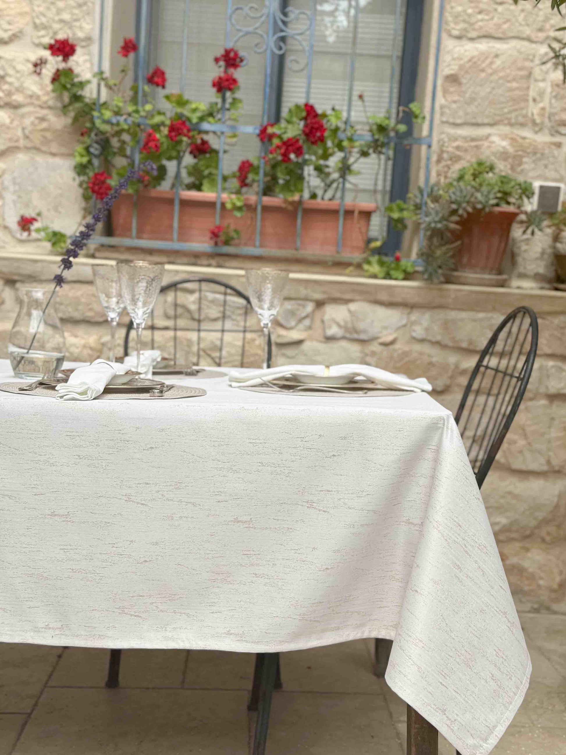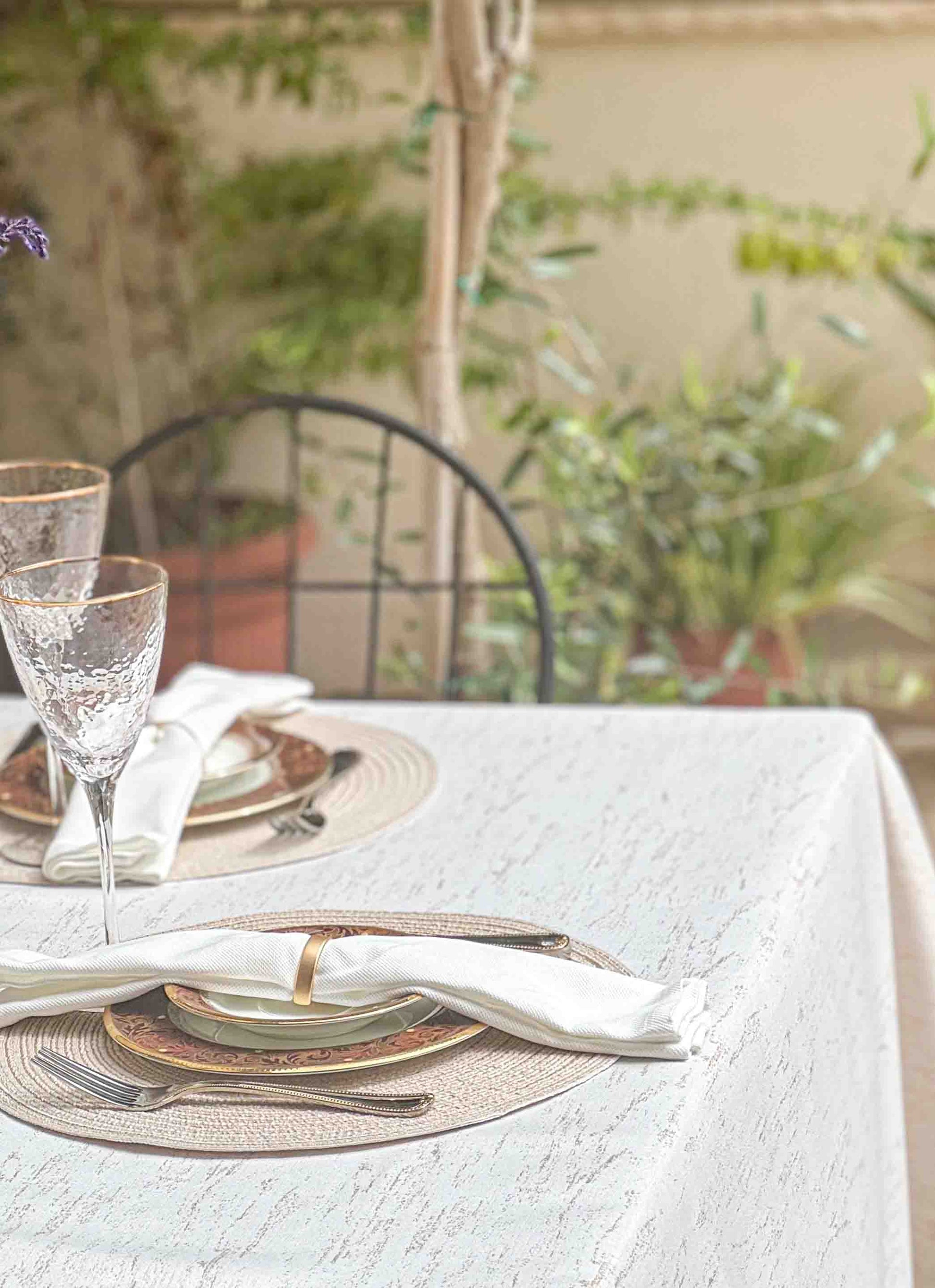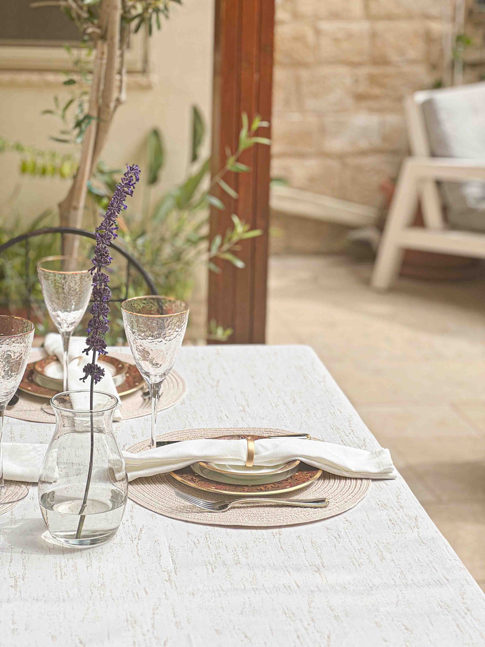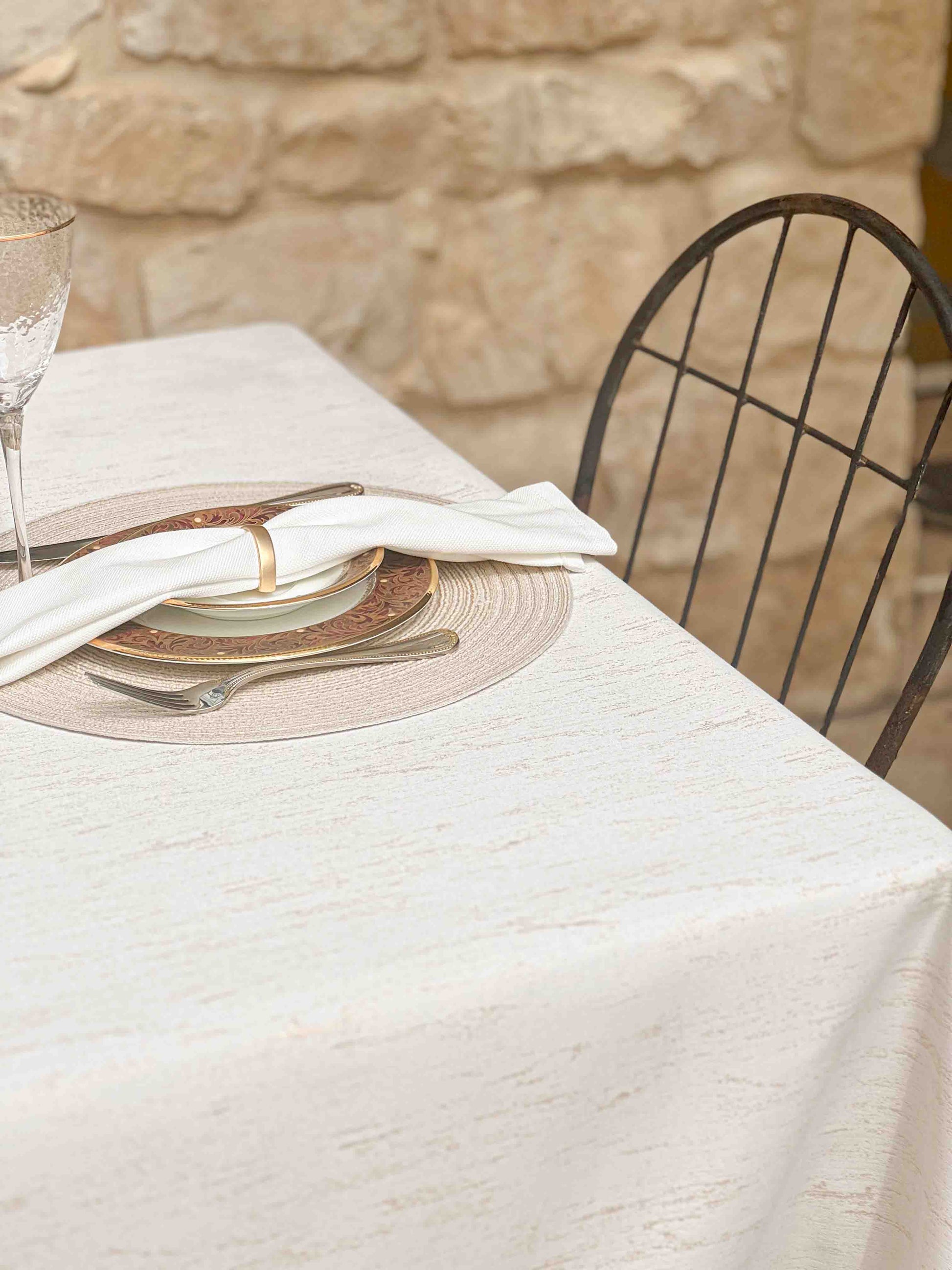 מפת שולחן בגוון אבן שקט ובהיר, עם טקסטורה טבעית שמעניקה עומק ועדינות לכל שולחן. עשויה 100% פוליאסטר איכותי, דוחה קמטים וכתמים, ומעניקה מראה מטופח ונקי לאורך כל האירוח. נגיעות הזהב משתלבות נהדר בסגנון מודרני, כפרי או נורדי – ויוצר תחושת רוגע ויוקרה שקטה. מושלמת לאירוח בסטייל, לארוחת בוקר של שבת או לערב חג אינטימי.